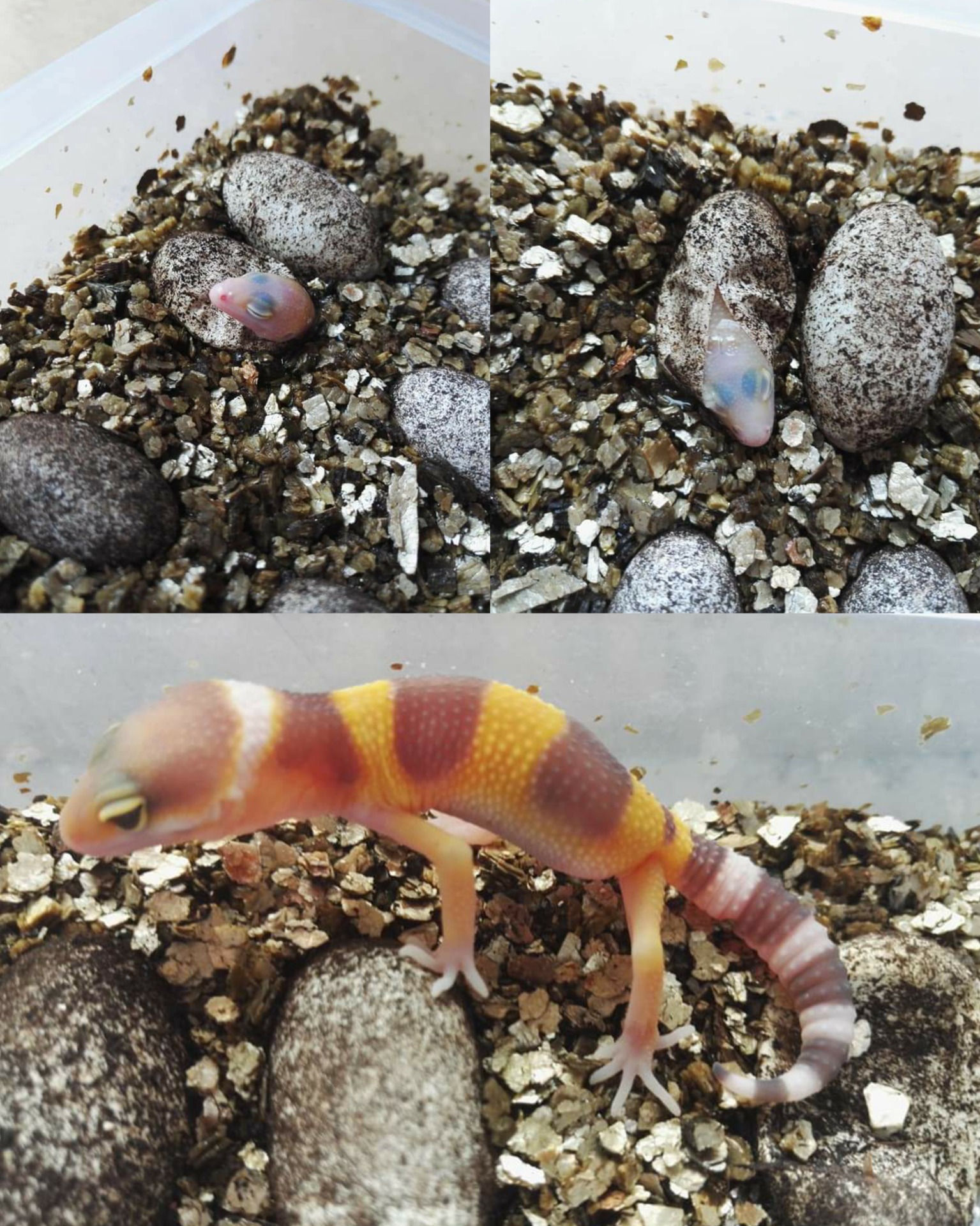 Gekončík se líhne od několika málo minut až po celé hodiny. S přesouváním mláďat do odchovných boxů nemusíme spěchat . . . pro mládě je velmi náročné se z vajíčka nějak vysoukat.