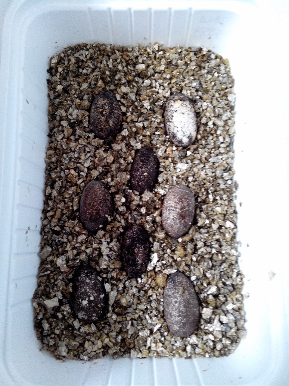 Nakladená vejce je co nejdříve od snůšky přemístit do předem nachystaného inkubátoru. Vajíčka ukládám do inkubačních krabiček každou snůšku zvlášť nebo do jedné větší krabičky dám vejce z více snůšek.Vajíčka gekončíků inkubuji na Vermikulit, který dobře drží vlhkost a neplesnivý. Při ukládání vajec do substrátu je důležité dodržet, aby bylo vejce tak do poloviny výšky zapuštěno do substrátu. Tím pádem se vyvarujeme zbytečnému vysychání vajíček. Jakmile dáme vajíčka do inkubační krabičky a následovně do inkubátoru, neměli by jsme s nimi už jakkoliv manipulovat a žádném případě otáčet!!!. Mohlo by dojít k úmrtí zárodku. Pokud dodržíme všechny výše uvedené podmínky, tak se mladý gekončík líhne přibližně po 60-70 dnech, při teplotě 26 - 32 °C a 75 -90 % vlhkosti. Po narození měří kolem 7cm a váži 2-3g. Na teplotě velice závisí i délka inkubace, poměr samiček, samečků a jejich zbarvení. Při teplotách kolem 26- 28°C se líhnou mláďata přibližně po 65dnech a jsou to v naprosté většině samičky. Při nižších teplotách je gekončík v dospělosti tmavší, než mláďata inkubovaná při vyšších teplotách. Při teplotách 29 - 32°C(maximální bezpečná teplota pro inkubaci) se líhne téměř 90% samečků a cca 10% samiček. Všechny mláďata budou světlejšího zbarvení s menším počtem černých skvrn a budou se líhnout už za 45 -50 dní.