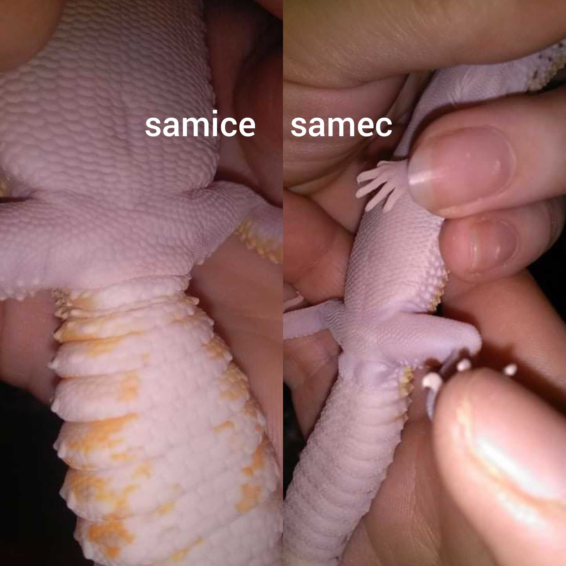 S rozlišením pohlaví nebývá u gekončíků složité. Při správné výživě a teplotě při výchově mláďat se dá pohlaví rozeznat již kolem 3-4 měsíce věku chovance. Všeobecně bývají samci větší a zavalitější než samice. Samec má řadu preanálních pórů a vystouplá pouzdra hemipenisu u kořene ocasu. Jsou to takové dvě malé kuličky v pouzdře za kloakou. Kvůli tomu má také zduřelý kořen ocasu. Tyto znaky samice gekončíka nenesou.